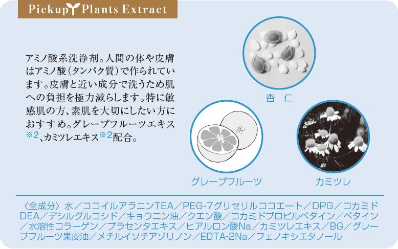 水/ココイルアラニンTEA/PEG-7グリセリルココエート/DPG/コカミドDEA/デシルグルコシド/キョウニン油/クエン酸/コカミドプロピルベタイン/ベタイン/水溶性コラーゲン/プラセンタエキス/ヒアルロン酸Na/カミツレ花エキス/BG/グレープフルーツ果皮油/メチルイソチアゾリノン/EDTA-2Na/フェノキシエタノール